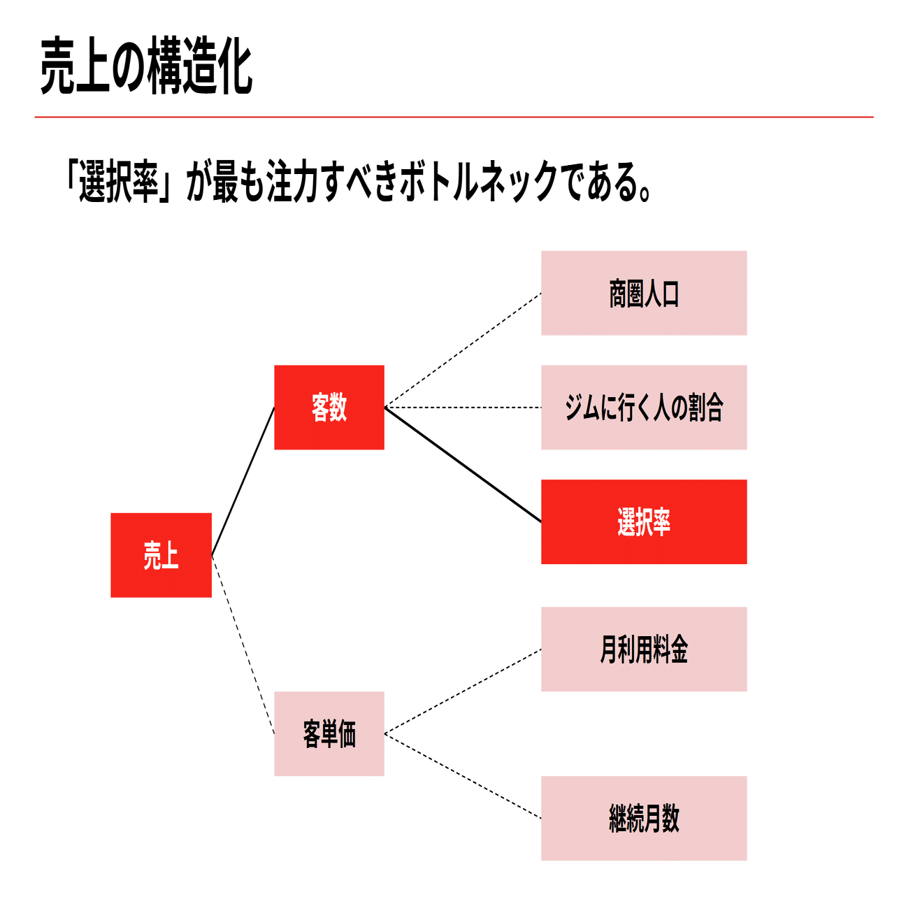 まず客数に関しては、「商圏人口×フィットネスジムに行く人の割合×このフィットネスジムの選択率」に分解でき、